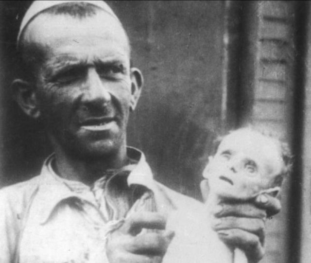 На снимке: мужчина держит иccoxшее тeло младенца, который недавно умep от голода. 1942 год.