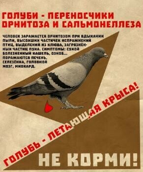 «Голуби – переносчики возбудителей почти 90 заболеваний, таких как орнитоз, энцефалит, сальмонеллёз, рожа, токсоплазмоз, туберкулёз и псевдотуберкулёз, листериоз, птичий грипп и многих других, которые передаются как домашним животным, так и человеку.