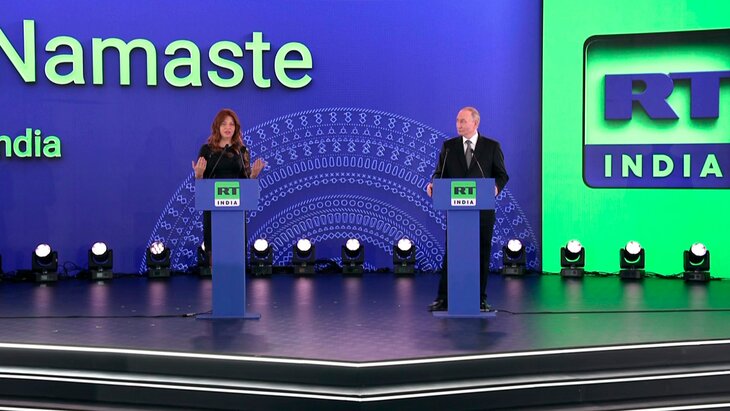Владимир Путин и главный редактор медиагруппы "Россия сегодня" и телеканала RT Маргарита Симоньян дали старт вещанию последнего в Индии.