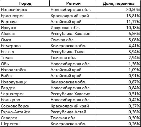 Спрос на жилье на территории Сибирского ФО не сильно централизован. Если, например, две трети приобретаемых в ипотеку новостроек на территории Уральского ФО находятся в Екатеринбурге и Тюмени, то на первичку Новосибирска, Красноярска и Барнаула приходится всего 58% спроса (30,5%, 15,8% и 11,8% соответственно).