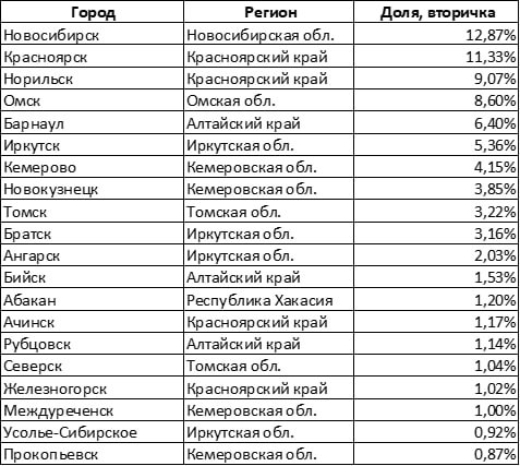 География вторичного жилья, ожидаемо, шире. На тройку лидеров приходится около трети — это Новосибирск (12,9%), Красноярск (11,3%) и Норильск (9,1%). Из городов, не являющихся административными центрами субъектов Федерации, чаще всего покупают готовые квартиры, кроме уже отмеченного Норильска, в Новокузнецке (3,9%) и Братске (3,2%).