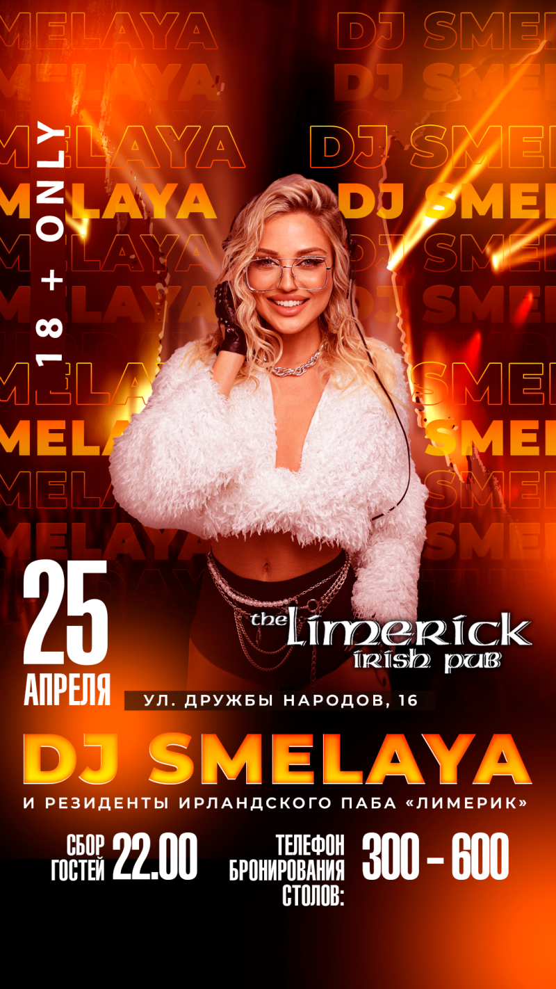 25 апреля в Ирландском Пабе "Limerick" вас ждут танцевальные сеты от DJ Smelaya.