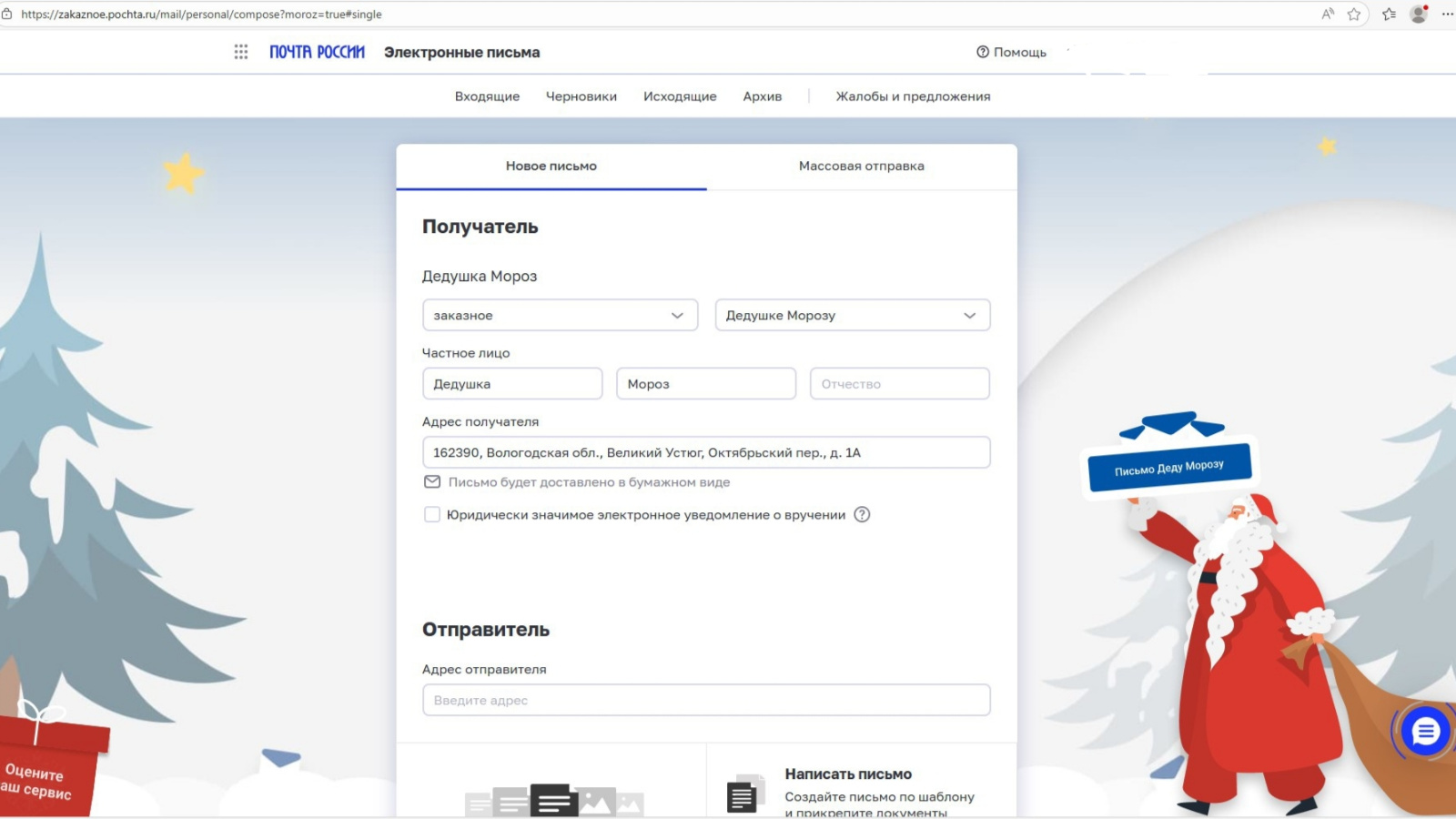 Татарстанцы, которые не успели в декабре отправить по почте послание главному волшебнику страны, могут это сделать, не выходя из дома на новогодних праздниках. Почтовики рассказали, как современные почтовые технологии поддерживают добрую новогоднюю традицию. Письмо Деду Морозу можно написать с помощью сервиса электронных заказных писем. Для этого не потребуется конверт и марка. Послание в цифровом виде Почта доставит за пару секунд. Алгоритм отправки очень простой: нужно зайти на сайт zakaznoe.pochta.ru , подключить сервис «Электронные заказные письма» через Госуслуги, если он ещё не активизирован, в поле «Получатель» выбрать вариант: «Дедушке Морозу» и адрес автоматически появится. Далее следует написать своё самое заветное желание, загрузить рисунок и отправить электронное послание. Дед Мороз из Великого Устюга хорошо знаком с цифровыми технологиями Почты. Он давно уже подключился к сервису электронных заказных писем, а значит отправленные ему цифровые письма почтовики не будут распечатывать и доставлять в резиденцию, он получит их мгновенно на свою электронную почту », ― рассказал директор регионального управления Почты России Ильнур Махмутов ЧИТАТЬ ВСЕ НОВОСТИ