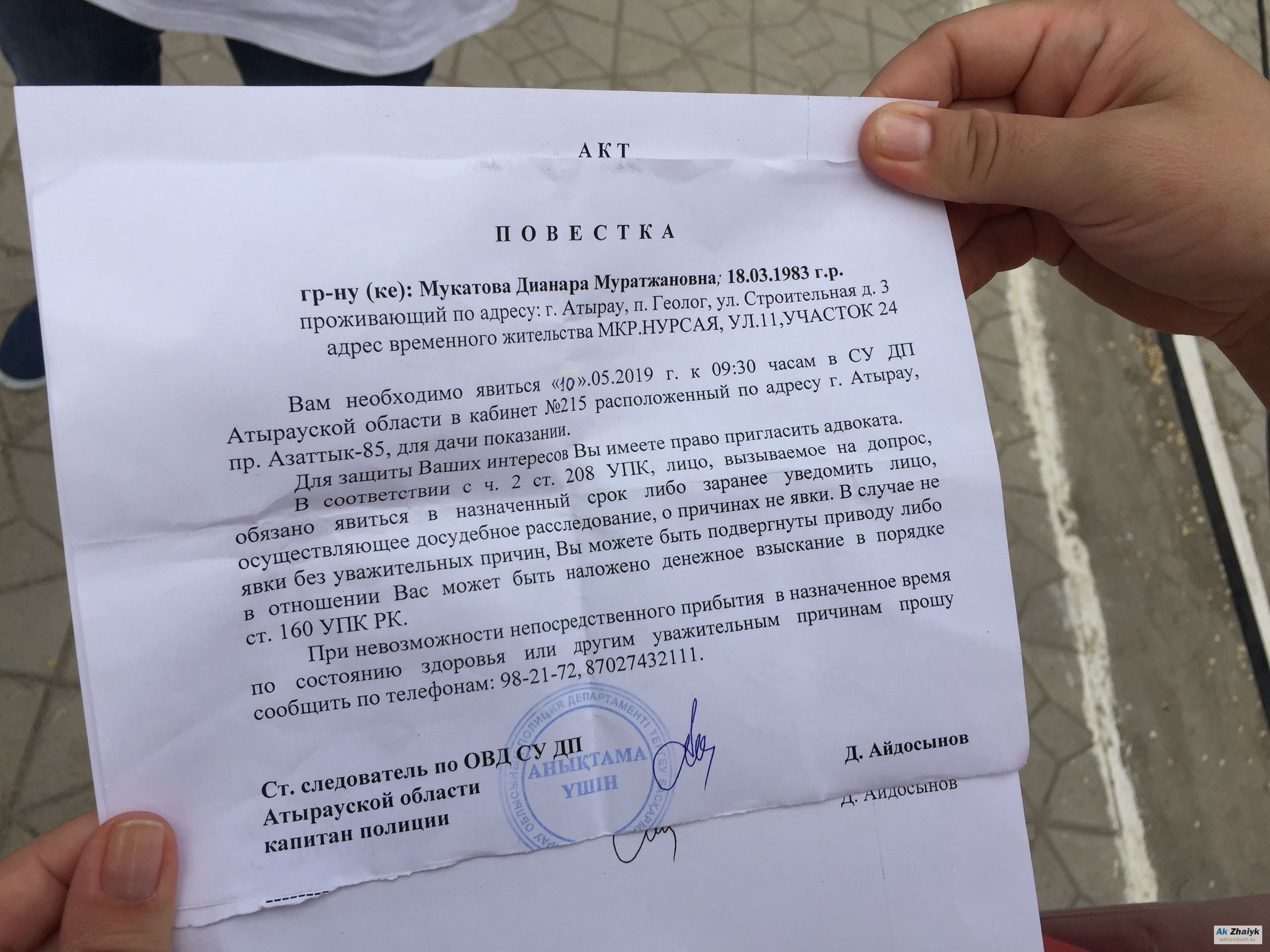 - Мне задавали вопросы личного характера, но я сказала, что без адвоката ничего говорить не буду. Позже подошёл оперуполномоченнный управления по борьбе экстремизмом Талгат НАСИПКАЛИЕВ, он, кстати, участвовал в нашем задержании. Продержали четыре часа и вручили повестку на допрос на завтра.