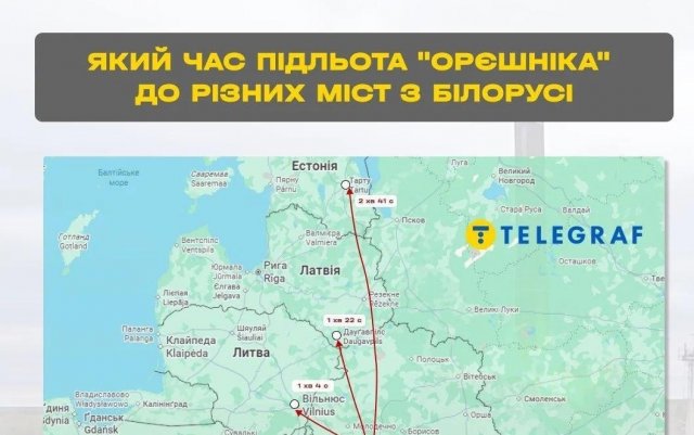 Время подлёта «Орешника» из Беларуси, где, по словам Лукашенко, его уже приняли на вооружение, до Киева составит полторы минуты, подсчитало издание Telegraf.
