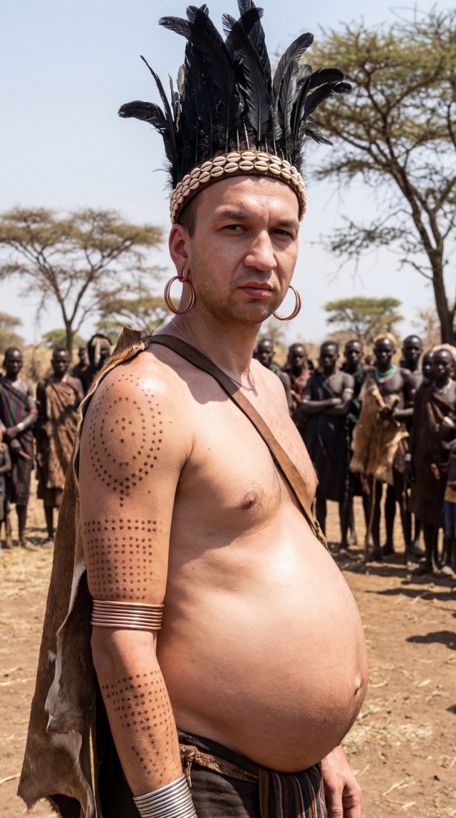 Кроме того, признаком особой красоты в племени считается очень большой живот, поэтому россиянин сейчас выглядит очень специфически.