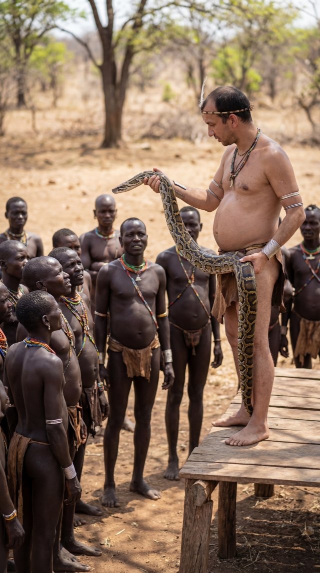 - По каким-то причинам змея не стала убивать русского туриста, и племя сохранило ему жизнь, выдав священное белое перо африканского марабу.