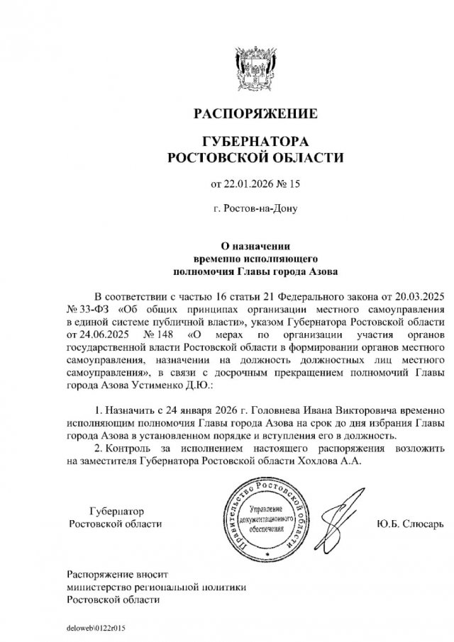 Губернатор Юрий Слюсарь назначил нового временного главу Азова. Им стал Иван Викторович Головнёв. Назначение вступает в силу с 24 января.