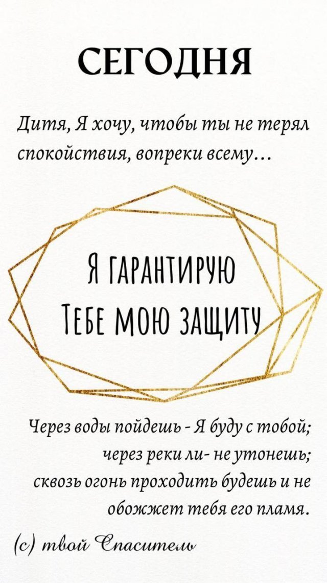 Не бойся.Как бы ни бушевали воды или как бы ни жарок казался огонь обстоятельств, ты не один. Тот, Кто держит мироздание в Своей руке, идёт рядом. Доверься Ему сегодня.