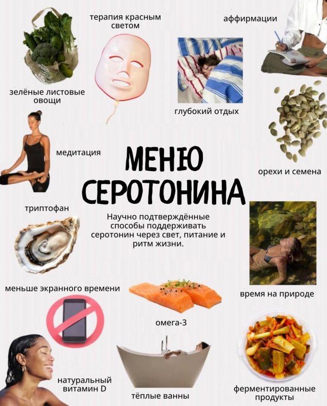 Серотонин стабилизирует настроение, снижает тревожность и способствует ощущению внутреннего комфорта; его уровень повышается благодаря солнечным прогулкам, полноценному сну и осознанию собственной значимости.