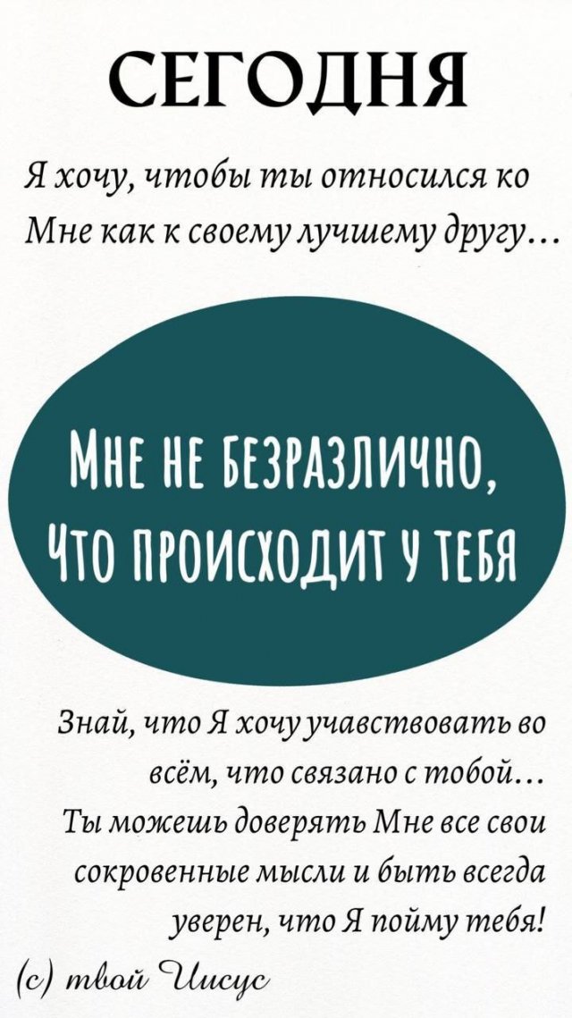 Он хочет участвовать во *всём*, что с тобой связано. Каждую мелочь, каждую мысль, каждую надежду и каждую тревогу можно доверить Ему. В Нём — абсолютное понимание и принятие.