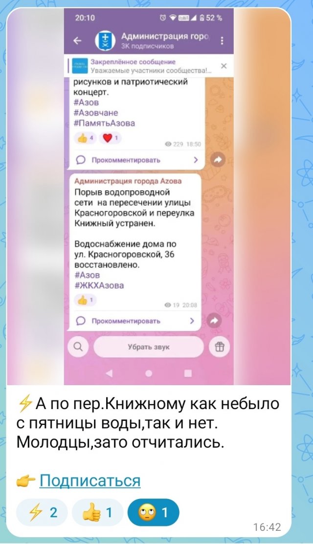 Все мы помним события прошедших выходных, когда Министерство ЖКХ Ростовской области совместно с вступившим первый день в свои обязанности новым и.о. Главы города Азова лично приехали курировать устранения аварийных ситуаций, спровоцированных порывами подземных коммуникаций, ответственным за надлежащее содержание и эксплуатацию которых является предприятие "Азовводоканал" (не факт, что уже муниципальное, но это отдельная "песня"🤦♀️)