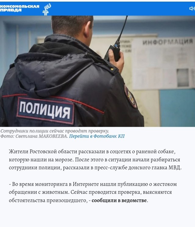 Жители Ростовской области рассказали в соцсетях о раненой собаке, которую нашли на морозе. После этого в ситуации начали разбираться сотрудники полиции, рассказали в пресс-службе донского главка МВД.