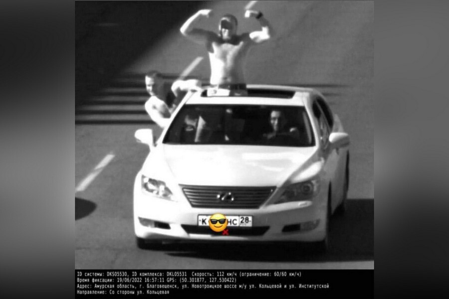 Фото опубликовал Telegram-канал Благовещенск № 1, подписав его: «Какой-то челендж нездоровый пошёл?». Один из мужчин высунулся в люк автомобиля, второй – из переднего пассажирского окна. Водитель остался в салоне седана.
