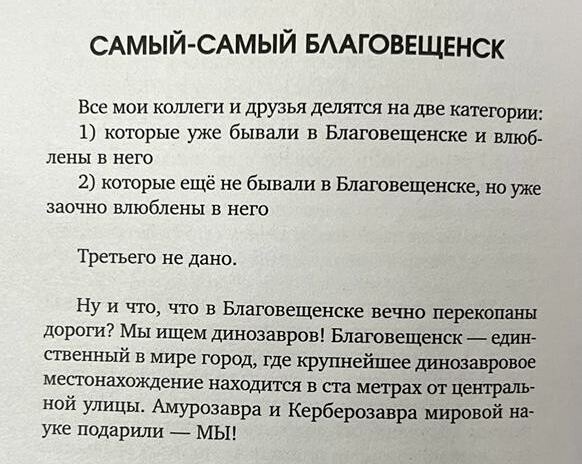 – Потому что Благовещенск – это безусловная любовь. Потому что вся книга буквально пропитана Благовещенском – там много упоминаний мест, улочек, в целом города. Собственно, и большинство историй было написано именно в Благовещенске. А еще по большому счету именно благодаря Благовещенску моя книга вышла в свет. Потому что когда моя игра «Самый-самый Благовещенск» получила в Кремле награду «Лучший образовательный издательский проект России», тогда я познакомилась с редактором издательства «Аванта» Татьяной Деркач, которая хотела сделать со мной «Самую-самую Москву», а в результате стала моим проводником в большую литературу. Именно она познакомила меня с Надеждой Ткачевой, которая была редактором знаменитого Славы Сэ. Надежда Петровна достаточно долго находилась в поиске нового автора и уже отчаялась его найти. Фразу «Будем делать книгу» она произнесла после того, как прочитала всего три моих текста. Сказала, что смеялась до слез, – так началось наше сотрудничество с АСТ.