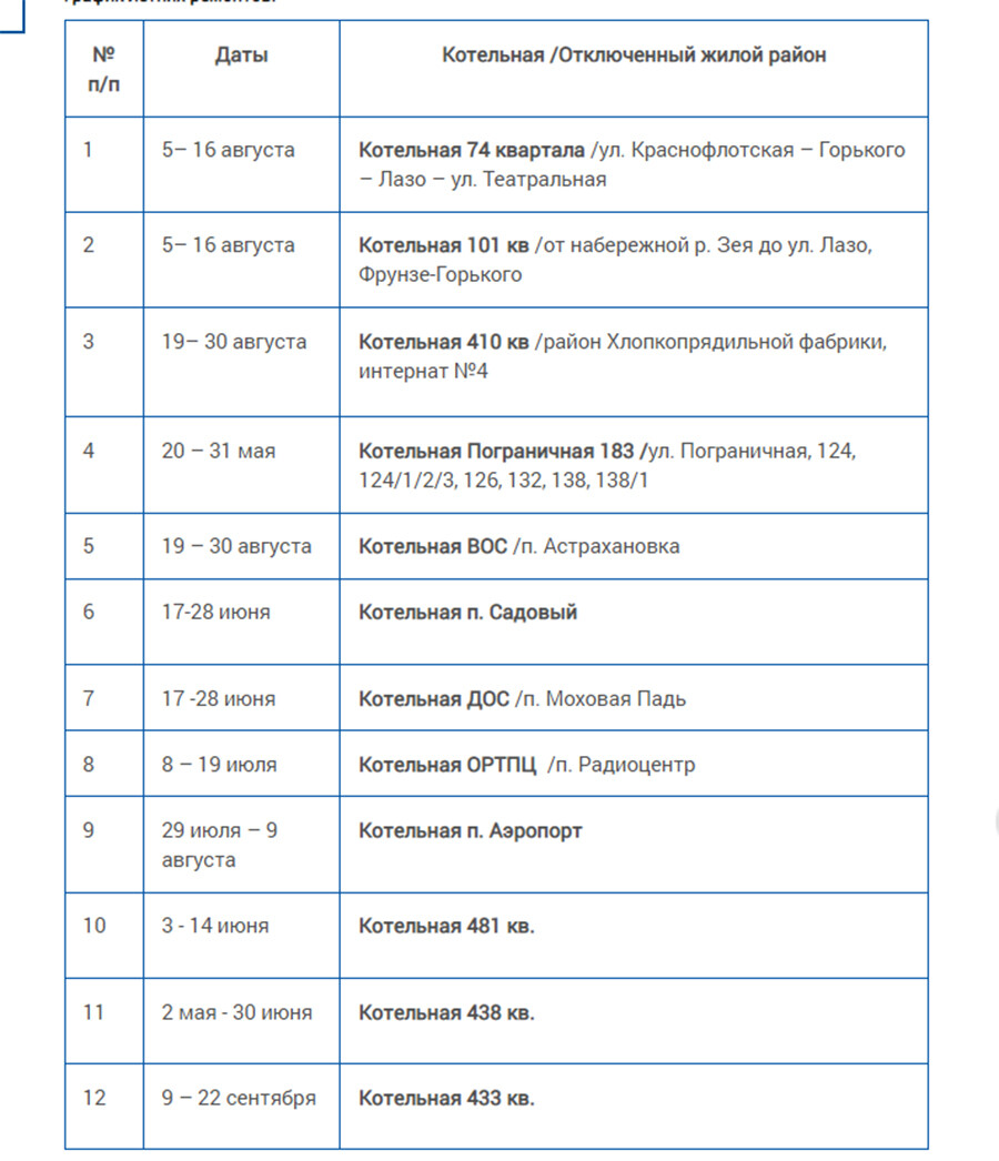 АКС Благовещенска опубликовали график отключения горячей воды для потребителей, которые получают ее от котельных