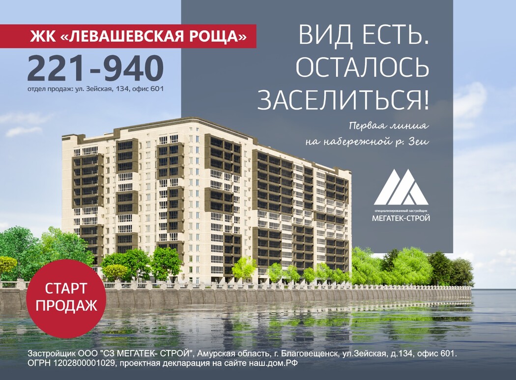 В Благовещенске стартовало строительство нового жилого комплекса «Левашевская роща» – дом бизнес-класса возводят в историческом месте вблизи парка Левашевская роща на берегу реки Зеи. По задумке застройщика, жители получат прекрасный вид из окон, так как дом будет располагаться на первой линии набережной, и вместе с тем – доступ к развитой инфраструктуре в этом районе. В настоящий момент квартиру в новом ЖК можно купить по гораздо более привлекательной цене.