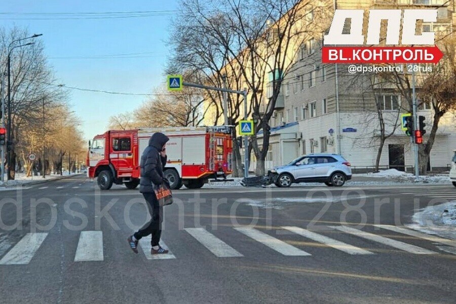 В областном центре на Горького – Пионерской столкнулись легковое авто и пожарный автомобиль, двигавшийся с проблесковыми маяками. Об этом сообщает Telegram-канал dpskontrol_28rus.