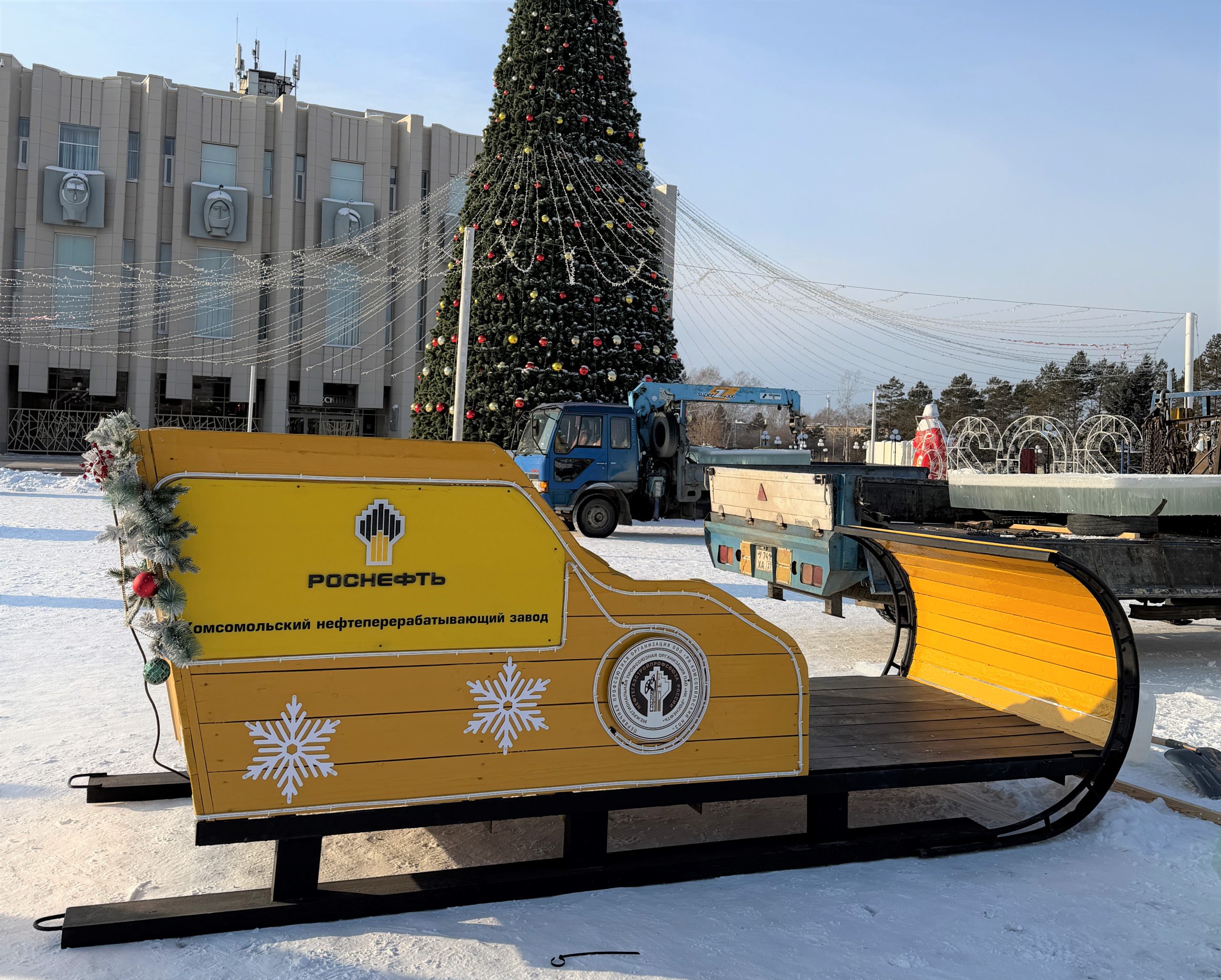 Еще один сюрприз нефтяники преподнесли всем жителям и гостям Комсомольска-на-Амуре: в центре Новогоднего городка на Театральной площади они установили четырехметровые сани Деда Мороза, украсив их праздничными атрибутами и иллюминацией. Арт-объект расположен между главной городской ёлкой и ледяной фигурой лошади, символизирующей наступающий год.