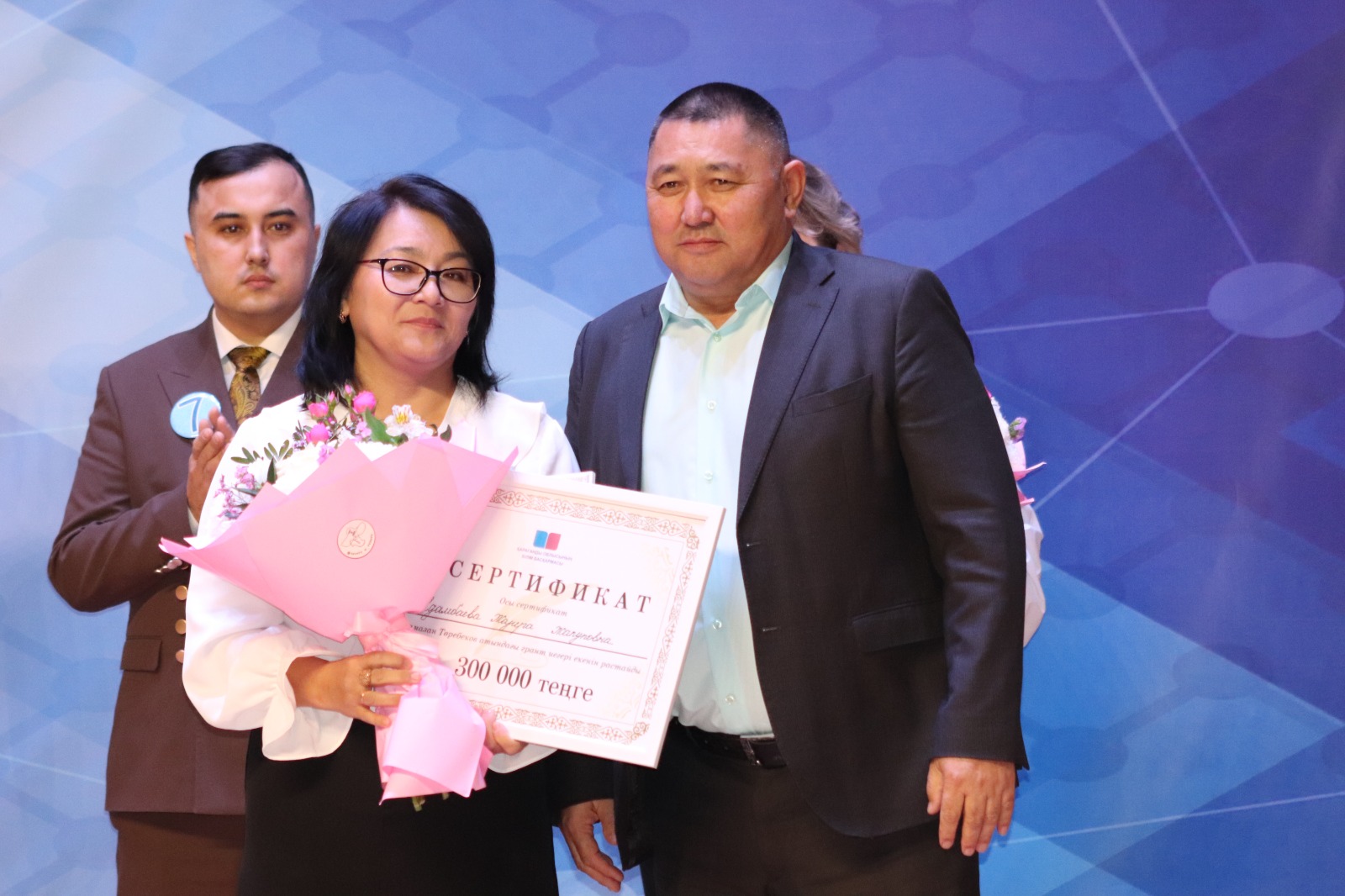 Был в церемонии ещё один приятный момент. Председатель Карагандинской областной организации Казахстанского отраслевого профсоюза работников образования, науки и высшего образования Алмагуль Ракишева и председатель профсоюза «Білім» Алия Жамбеисова вручили всем участникам специальные призы – денежные сертификаты и сертификаты для оздоровительного отдыха.