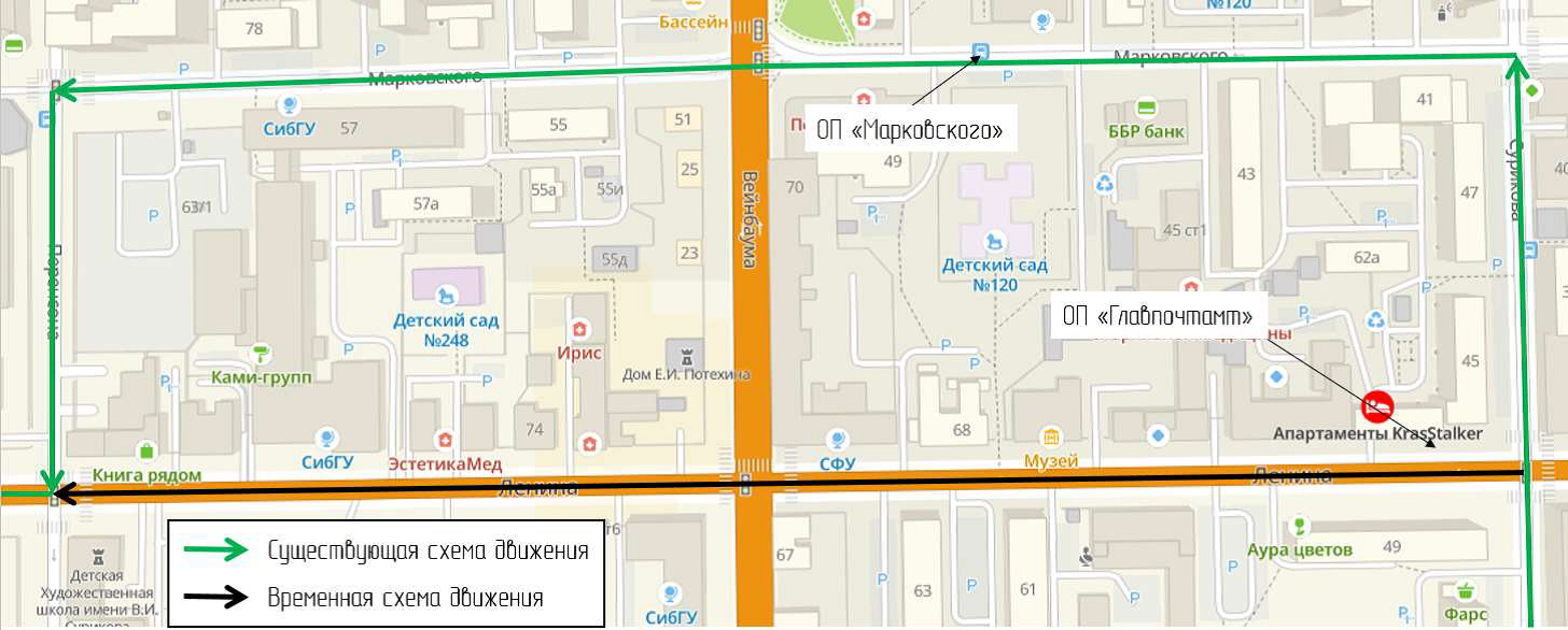 Временная схема движения маршрутов №№ 2, 43, 52 в направлении Октябрьского района: ул. Карла Маркса – ул. Сурикова – ул. Ленина и далее по прежним схемам.