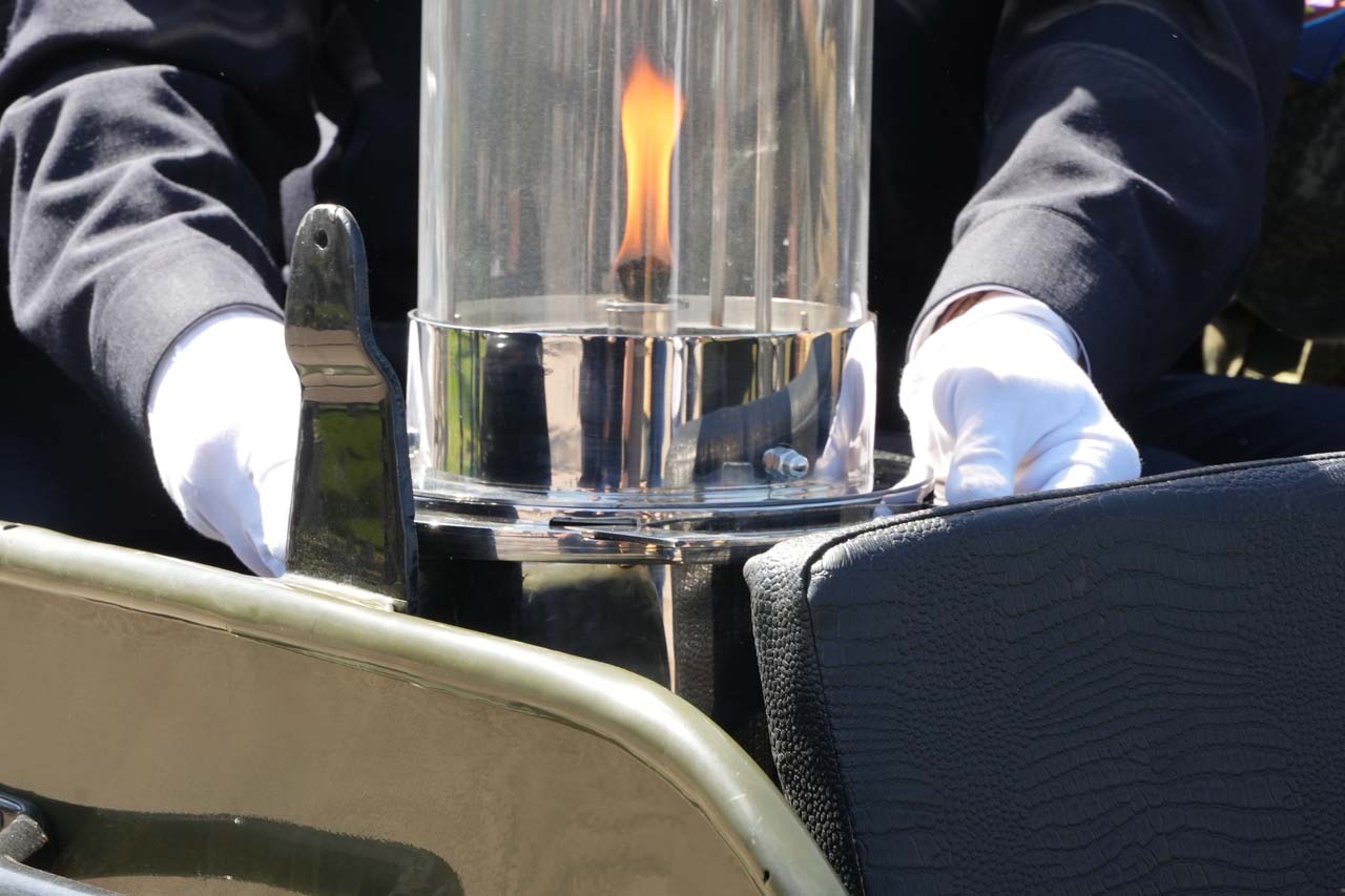 Миновав живой коридор из постовцев, лампаду доставили в раритетный автомобиль, на котором огонь транспортировали на стелу «Город трудовой доблести» в Ленинском районе. Это место станет первой точкой пребывания огня и несения там почётной караульной службы. В течение нескольких месяцев, на период реконструкции «Мемориала Победы», огонь побывает во всех районах города Красноярска.