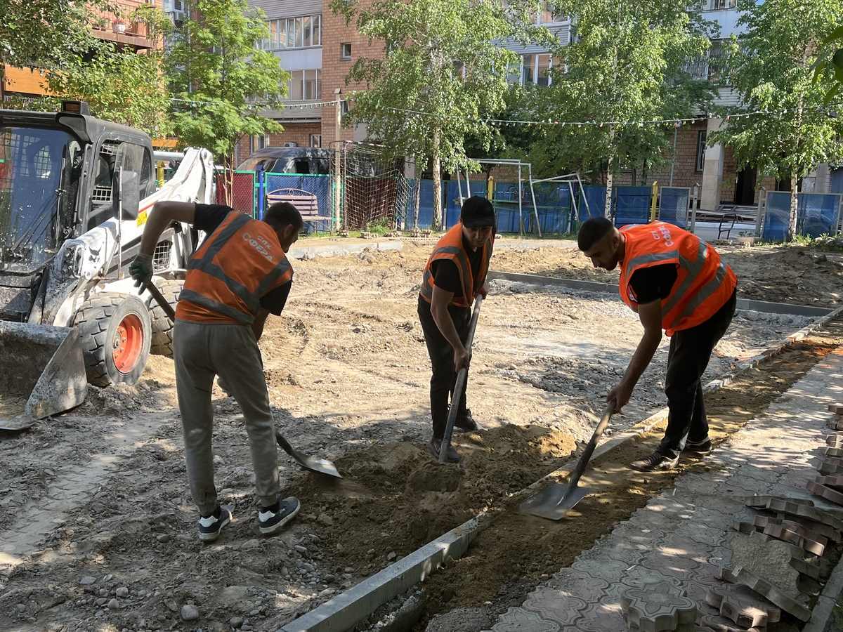 Благоустроят в этом году и двор на Краснодарской, 9. Рабочие обустроили новые пешеходные дорожки, обновили проезд и заменили бордюры.