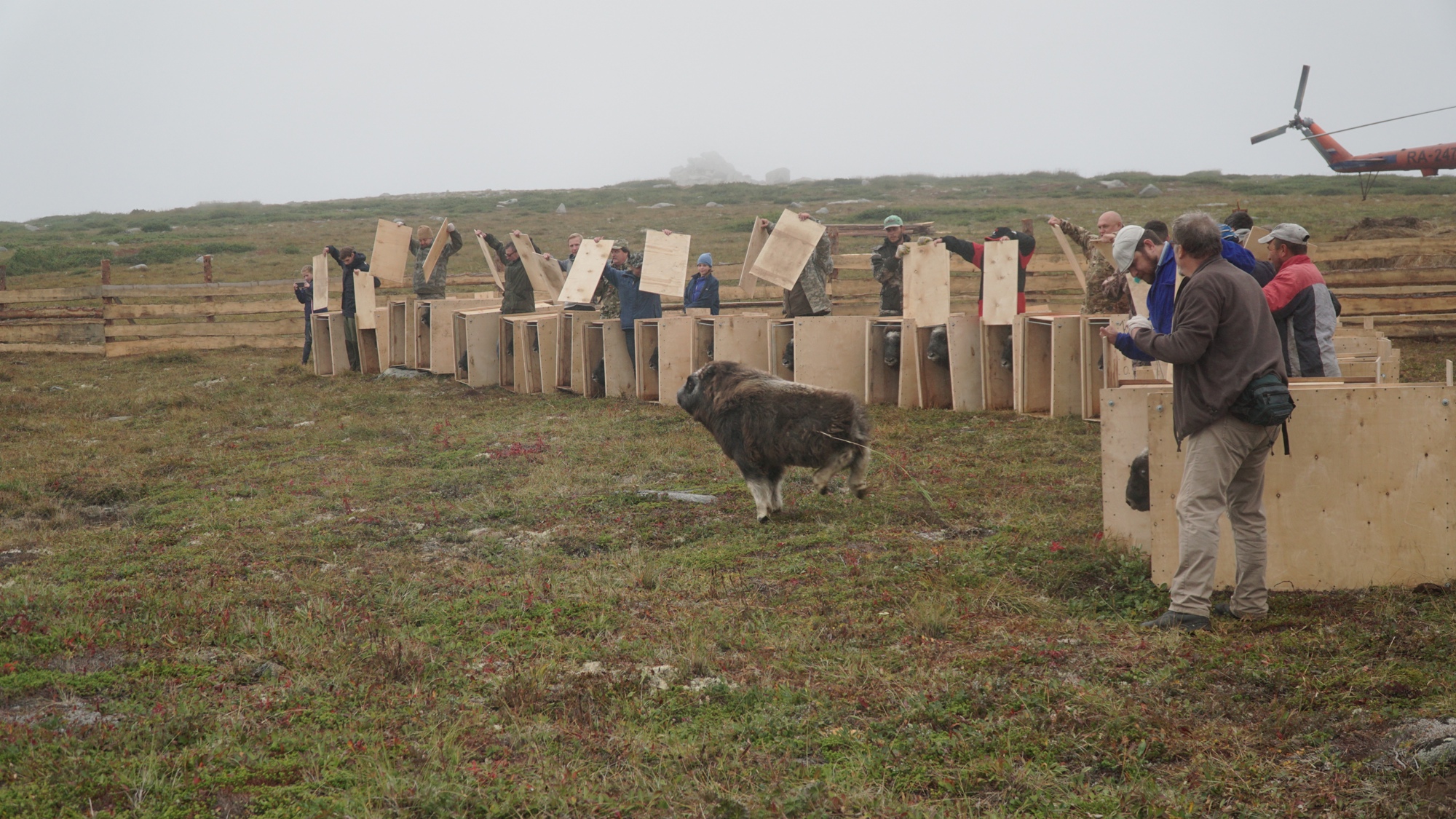 Загон для них площадью около 300 квадратных метров мастерили целую неделю. Он нужен, чтобы легче было охранять телят от возможного нападения медведей, а также, чтобы удобнее было за ними следить. Потом, когда медведи залягут в спячку, овцебыки смогут выйти за пределы вольера и начать осваивать остров.