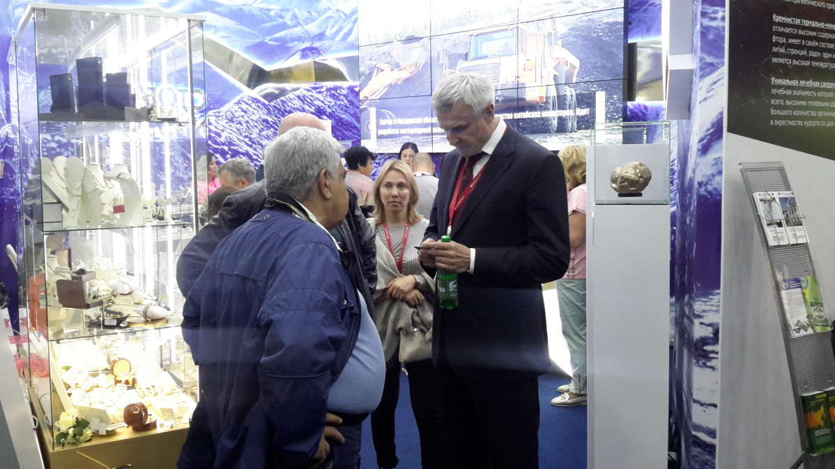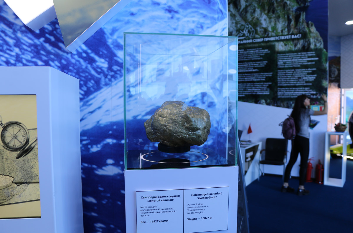 Магаданская область раскрывает свои богатства в павильоне, разделенном на три корпуса золотого, серебряного и белого цветов. Они означают золото, серебро и снег. Регион занимает 1 место в России по добыче серебра и россыпного золота, 2 - по добыче рудного золота.В павильоне представлены муляжи самых известных золотых находок, найденных в недрах Магаданской области: «Золотои? великан» и «Мефистофель».