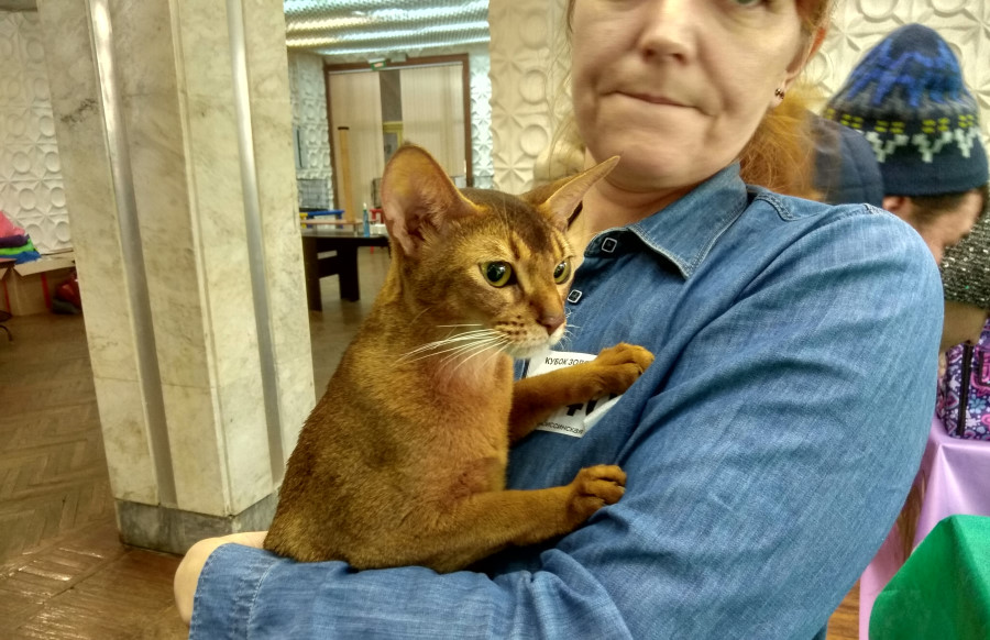 Единственная в регионе абиссинка участвует в показах второй год, она приехала из Новосибирска. Блестящая песочно-золотая шерсть волосок к волоску, грация, изящество осанки, силуэта и движений, спокойствие и благородство, общительность и такт, сильный материнский инстинкт – вот признаки этой кошки.