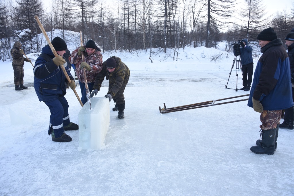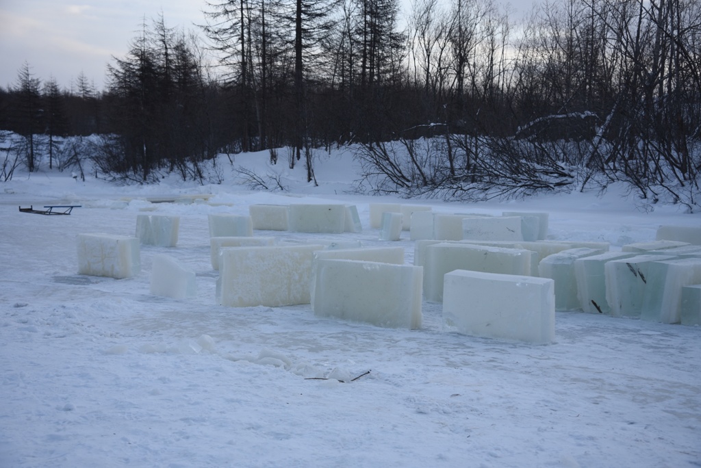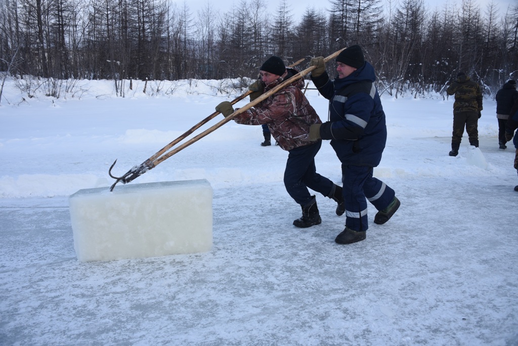 Работники КЗХ сетуют на погоду – морозы этой зимой несильные, а потому и чистый лед, который необходим художникам, выпилить непросто. Ежедневная норма – 10 кубометров.