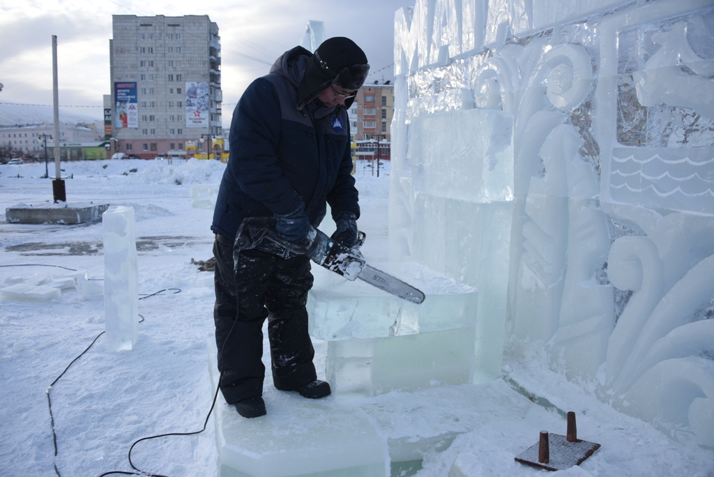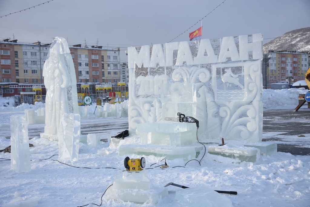 На Магаданской площади рождается сказка – здесь работают якутские скульпторы, которые подарят горожанам и гостям колымской столицы ледовые фигуры, а также трех-, двухполосную горку и другие объекты.