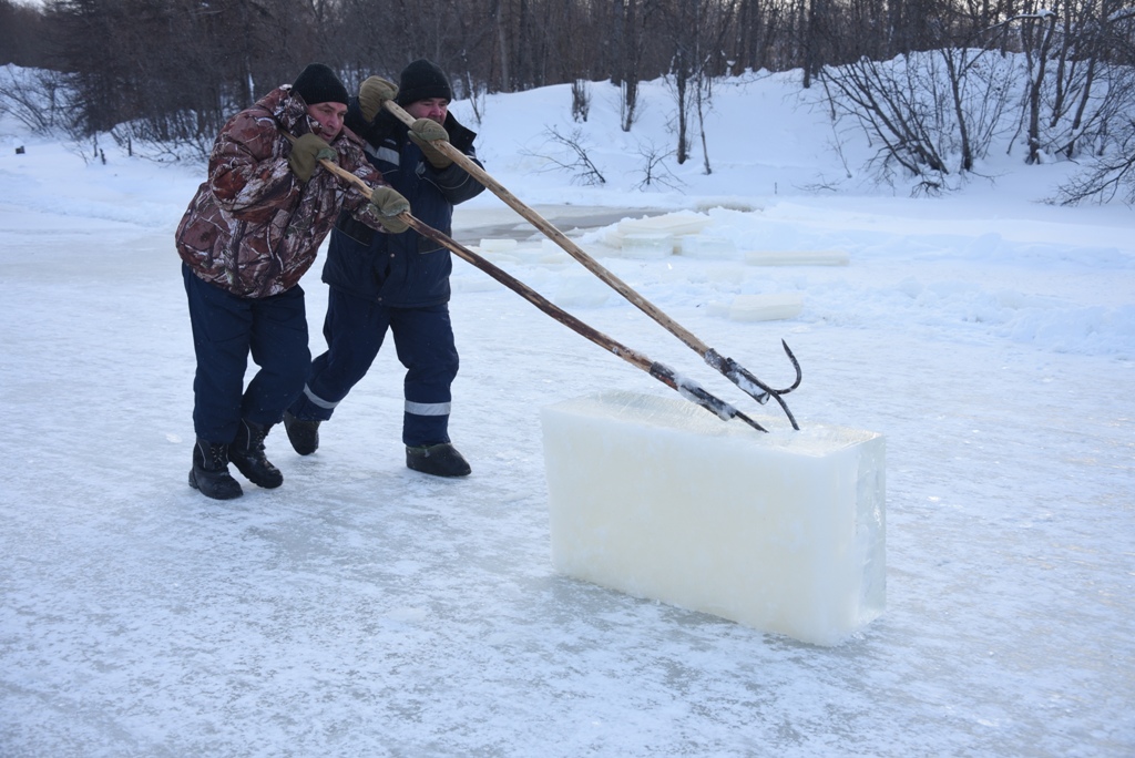 «Блоки мы выпиливаем 1 метр на 60 см, - отмечает бригадир рабочей группы по заготовке льда КЗХ Константин Пазников. - Толщина блоков – около 20 см. Сначала мы выпиливаем куски, затем их необходимо просушить от воды, снять грязный, нечистый слой, а потом доставить ледорезам. Пока куски получаются не слишком толстые, но когда установятся крепкие морозы, мы сможем выпиливать блоки и до 50 см – так работа пойдет быстрее».