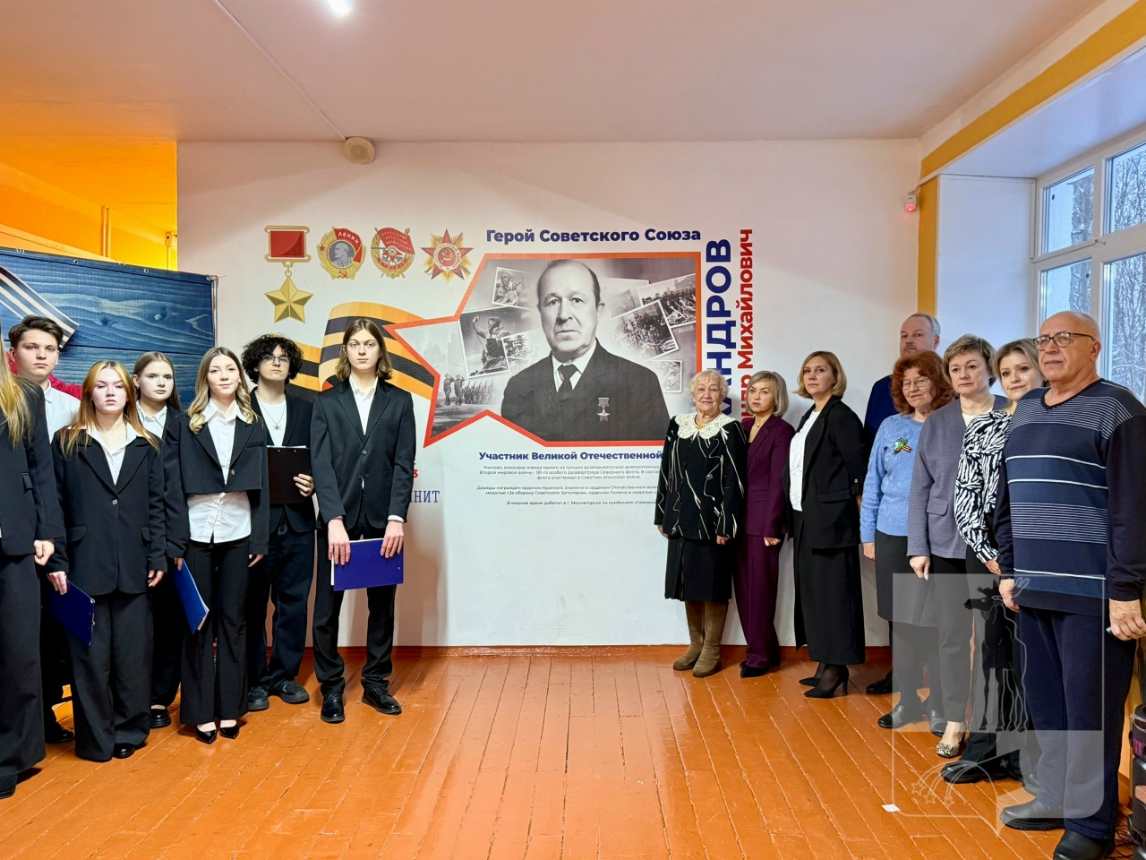 В стенах школы № 1 имени А. Ваганова сегодня торжественно открыли мурал в честь героя Советского Союза, участника Великой Отечественной войны Александра Михайловича Никандрова. Открытие мурала проходило в рамках патриотического проекта партии «Единая Россия» «Лица Героев» при поддержке Министерства Просвещения РФ.