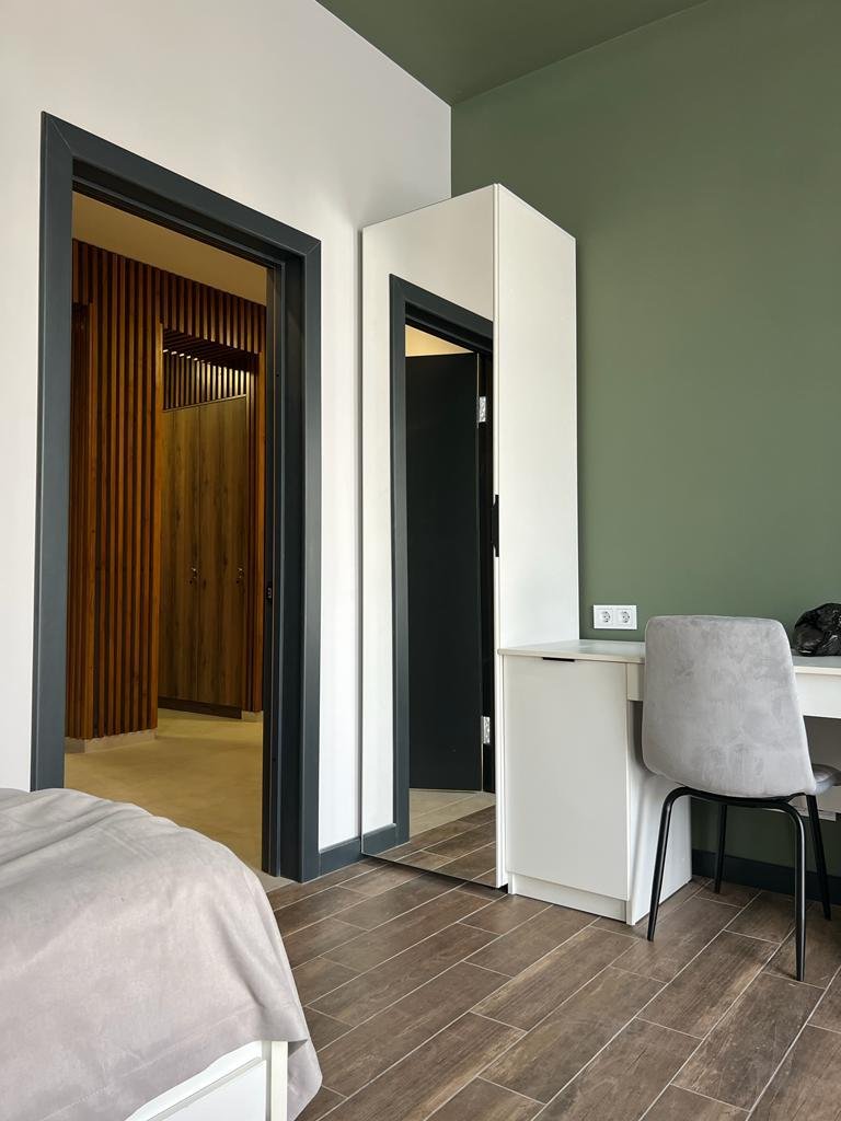 Дополнительное оборудование: современная кухня и ванная, душ, туалет, отдельный шкафчик в коридоре, чайник, холодильник, микроволновка, стиральная машина.