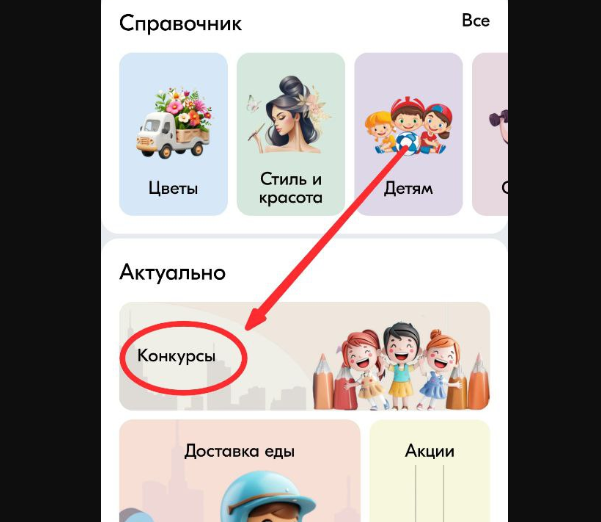 2. Открыть вкладку конкурсы на главном экране - пролистайте вниз.