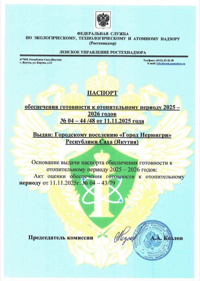 11 ноября ГП "Город Нерюнгри" получил паспорт обеспечения готовности к отопительному периоду периоду 2025 - 2026 гг.