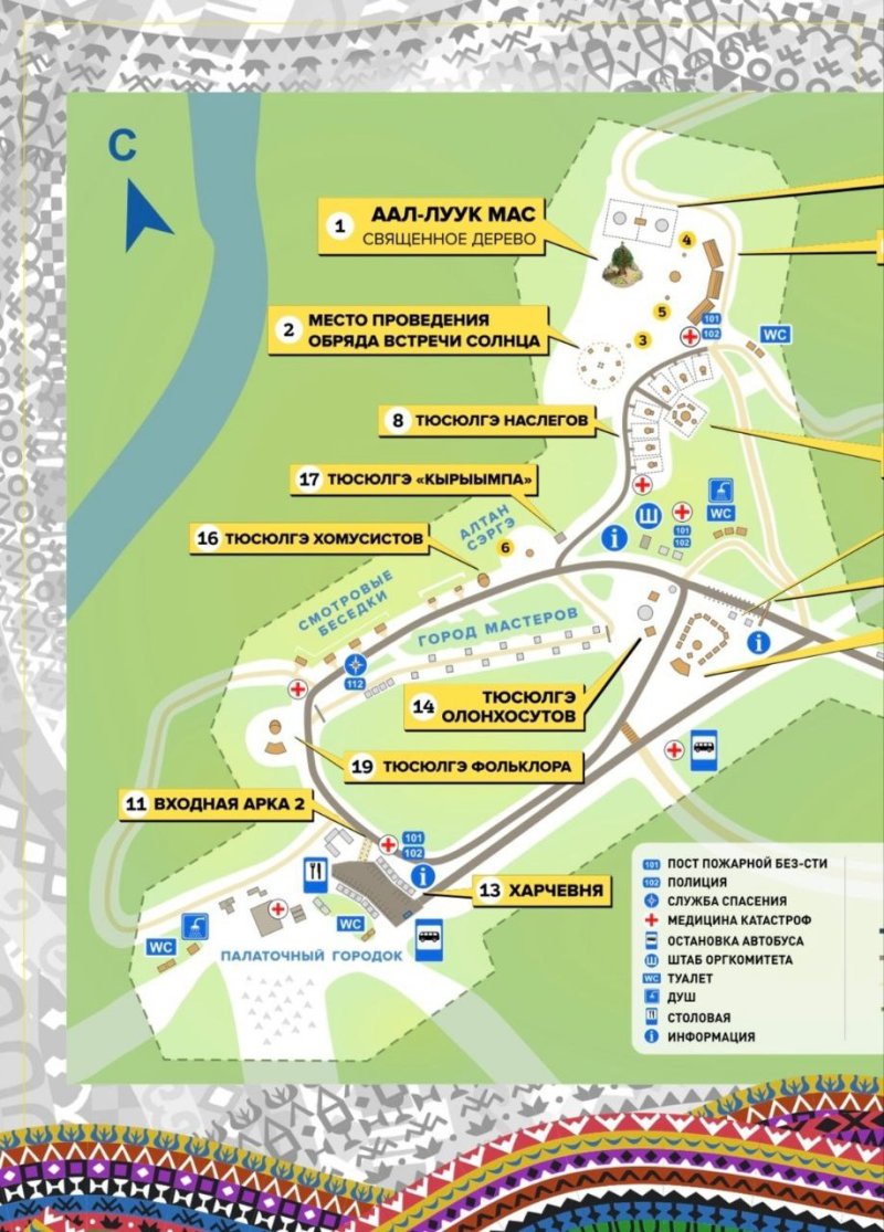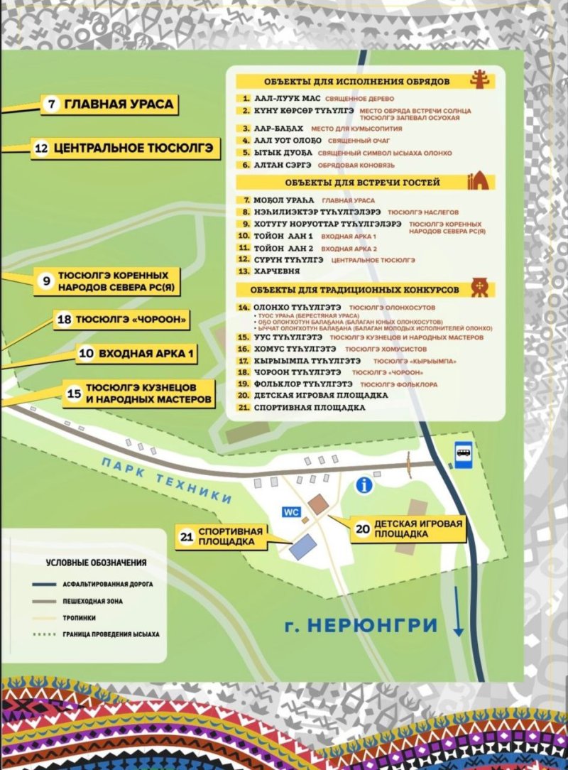 Сам праздник проходил внутри священного круга — тюсюлгэ, что значит "место, куда спускаются Боги". Это место под открытым небом, где люди общались с небесными и земными силами. При входе в этот круг люди очищались от плохих мыслей и готовились принять благословение от Богов.