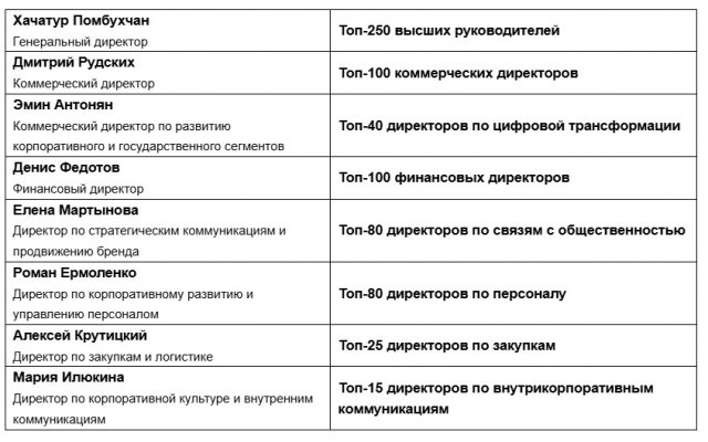 Также в тройку лучших вошли директор по связям с госорганами Владимир Месропян, директор по правовым вопросам Сергей Переверзев, директор по развитию корпоративного бизнеса Наталья Талдыкина, директор по бренду и маркетинговым коммуникациям Татьяна Гура, директор по складской и транспортной логистике Татьяна Гусева, директор ИТ-инфраструктуры Павел Табашников, руководитель проектов по социальным программам Оксана Туранцева и корпоративный секретарь Дарья Лизунова.