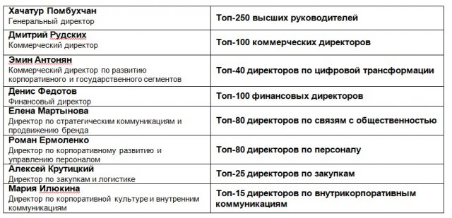 Также в тройку лучших вошли директор по связям с госорганами Владимир Месропян, директор по правовым вопросам Сергей Переверзев, директор по развитию корпоративного бизнеса Наталья Талдыкина, директор по бренду и маркетинговым коммуникациям Татьяна Гура, директор по складской и транспортной логистике Татьяна Гусева, директор ИТ-инфраструктуры Павел Табашников, руководитель проектов по социальным программам Оксана Туранцева и корпоративный секретарь Дарья Лизунова.