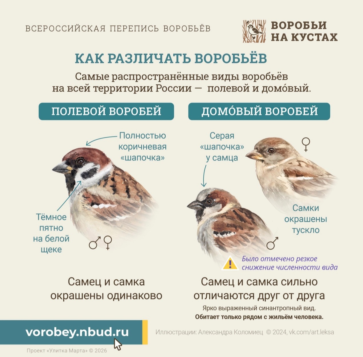 Эти птицы, особенно привычный домовый воробей, тысячелетия живут рядом с человеком, но в последние десятилетия их численность по неясным причинам стала сокращаться по всему миру. Такие изменения служат тревожным сигналом о состоянии окружающей среды. Полевой воробей, хотя и может обитать вдали от людей, также все чаще соседствует с нами. Чтобы понять эти тенденции, специалистам нужны актуальные данные, собранные по всей стране.