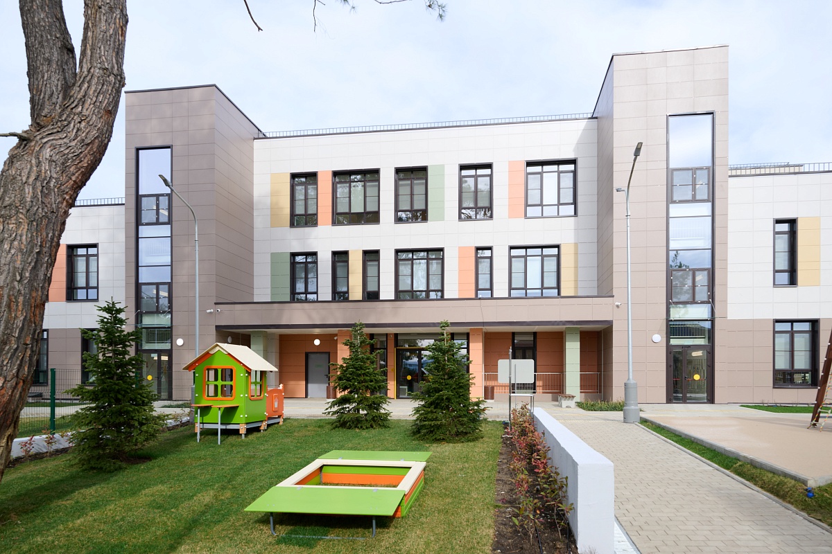 Не обошли стороной и прилегающую территорию. На участке в 0,6 гектара высажены деревья и кустарники, разбиты газоны. Для безопасности малышей площадки оснащены мягким покрытием, а входы в здание приспособлены для маломобильных групп населения.