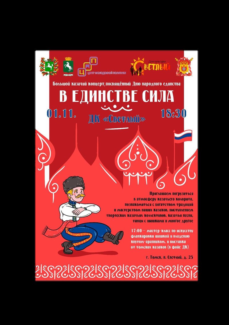 1 ноября в 17.00 в Доме культуры «Светлый» (п. Светлый, д. 25) состоятся выставка и мастер-класс по фланкировке шашкой и владению кнутом-арапником; в 18.30 — казачий концерт «В единстве наша сила».