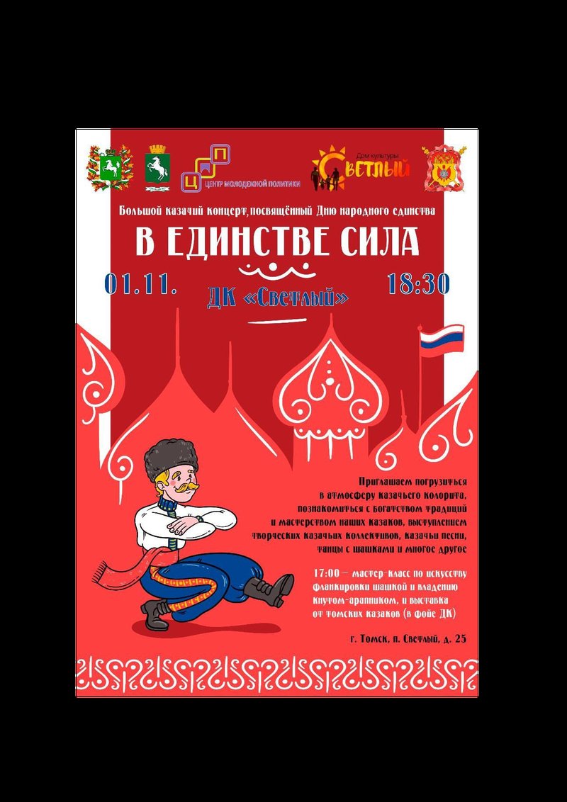 Завтра, 1 ноября, в Доме культуры «Светлый» (п. Светлый, д. 25) пройдёт казачий концерт «В единстве наша сила».