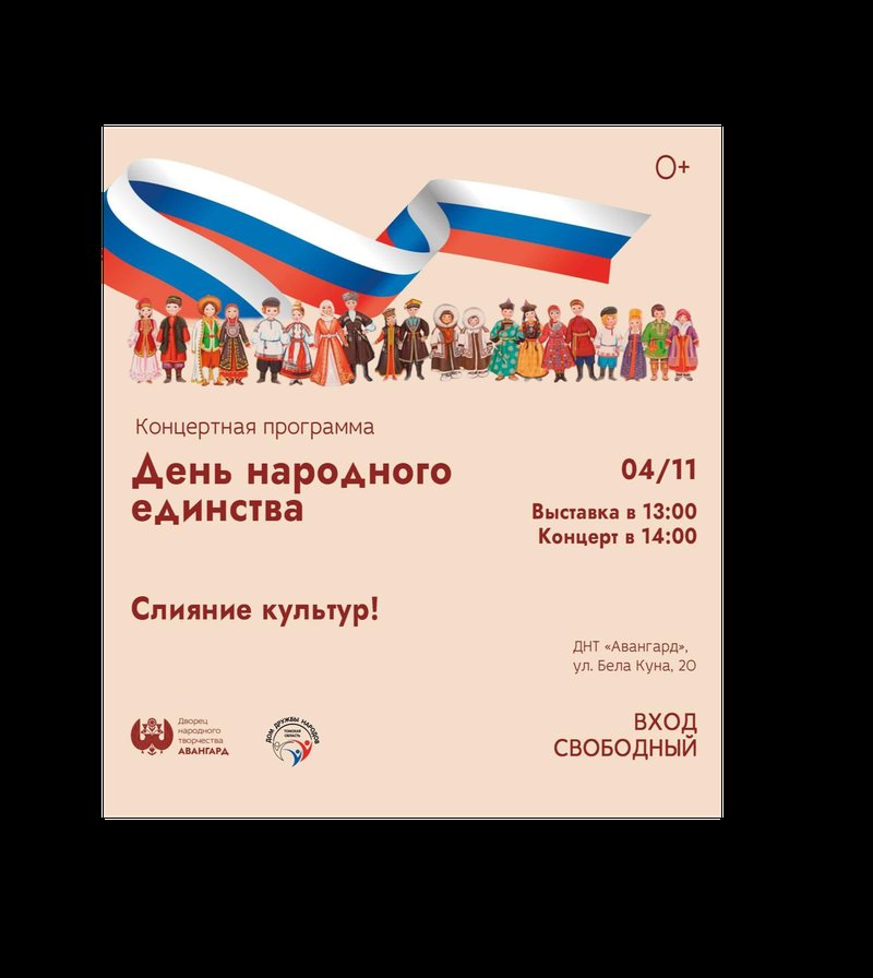 В 13.00 во Дворце народного творчества «Авангард» (Томск, ул. Б. Куна, 20) откроется выставка-ярмарка с разнообразной продукцией, сувенирами и фотозонами от национально-культурных организаций Томской области; в 14.00 — концертная программа с вокальными и танцевальными номерами, демонстрирующими многообразие культуры нашей страны (ансамбль горского танца «Даймохк», коллективы Центра татарской культуры и Российско-немецкого дома).