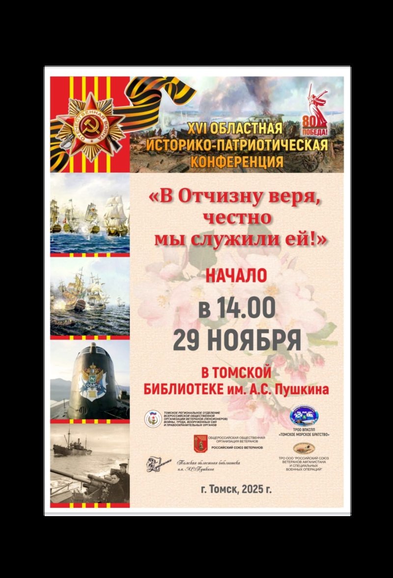 Завтра, 29 ноября, в 14.00 в Томской областной библиотеке им. А.С. Пушкина (ул. К. Маркса, 14) состоится XVI областная историко-патриотическая конференция «В Отчизну веря, честно мы служили ей!».