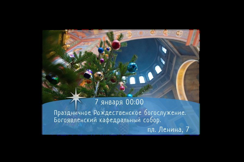 В полночь 7 января прямой эфир с Рождественского богослужения в Богоявленском кафедральном соборе Томска (пл. Ленина, 7) можно увидеть на региональном телеканале «Томское время», а также в группе «Томская область» в социальной сети «ВКонтакте».