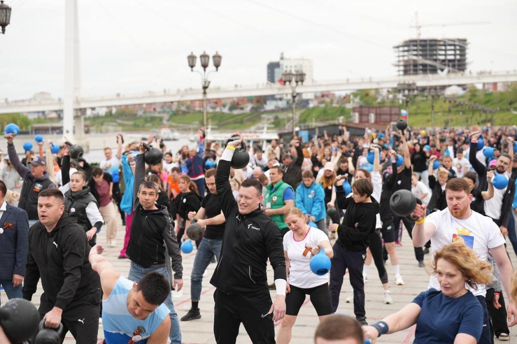В этот же день жители на набережной установили новый рекорд России по самому массовому поднятию гирь. Участниками спортивно-патриотического мероприятия "Сила единства – вес Победы! Поднимем гири, чтобы поднять дух региона" стали 590 человек. Тюменцы разных возрастов делали армейский рывок гирь весом от 6 до 32 кг в течение девяти минут. Верификацию рекорда также провел Станислав Коненко.