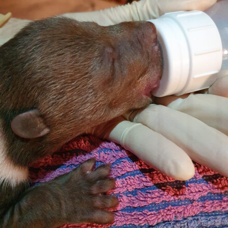 «При поступлении малышам было всего около 7-9 дней, весили они немногим более 700 грамм. Поначалу Кузя вел себя активно и хорошо ел, а вот Карел отказывался от еды. Но через два дня ситуация радикально изменилась: Карел начал активно есть и набирать вес, а состояние Кузи стало стремительно ухудшаться – все-таки пневмония. Буквально за несколько часов из бойкого, очень активного и громко кричащего медвежонка Кузя превратился в еле подвижное крохотное тельце практически без проявления признаков жизни, – сообщают в Центре. – Мы незамедлительно совместно со специалистами-ветеринарами по диким животным из Госпиталя Дикой Природы начали лечение антибиотиками, постоянно наблюдая за малышом и его состоянием. Пять суток непрерывного контроля и лечения: за это время Кузе становилось то немногим легче, то он впадал в еще более критическое состояние, что не давало никаких надежд на благополучный исход. Но через пять дней с начала борьбы за жизнь малыша, Кузя начал понемногу поправляться. Сейчас медвежонок неплохо ест, проявляет активность, потихонечку набирает вес. Но лечение еще продолжается».