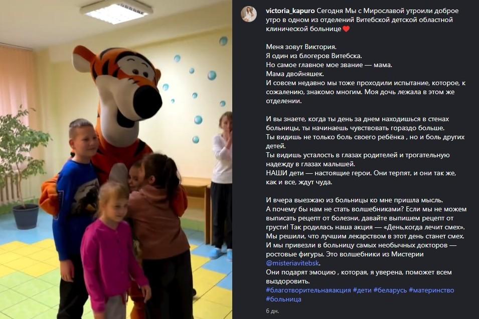 Собрав команду единомышленников, витебский блогер Виктория Капуро и коллектив семейного парка «Мистерия» создали волшебную атмосферу для мальчиков и девочек, которые, несмотря на временные трудности со здоровьем, ждут чудес. В оториноларингологическое отделение областной клинической детской больницы пришли «волшебные доктора» – аниматоры с ростовыми куклами, – которые превратили обычный день в настоящую феерию смеха и радости.